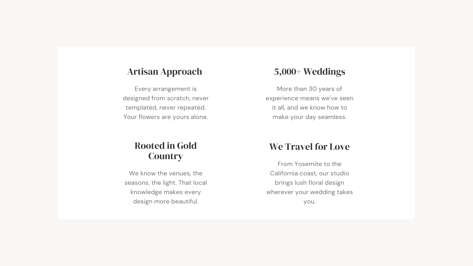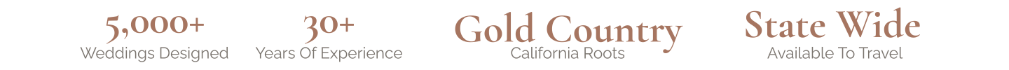 We'd love to hear about your vision. Fill out the form below and we'll be in touch as soon as possible. Whether you're planning a grand Gold Country celebration or an intimate mountain ceremony, we can't wait to design something extraordinary for your day.